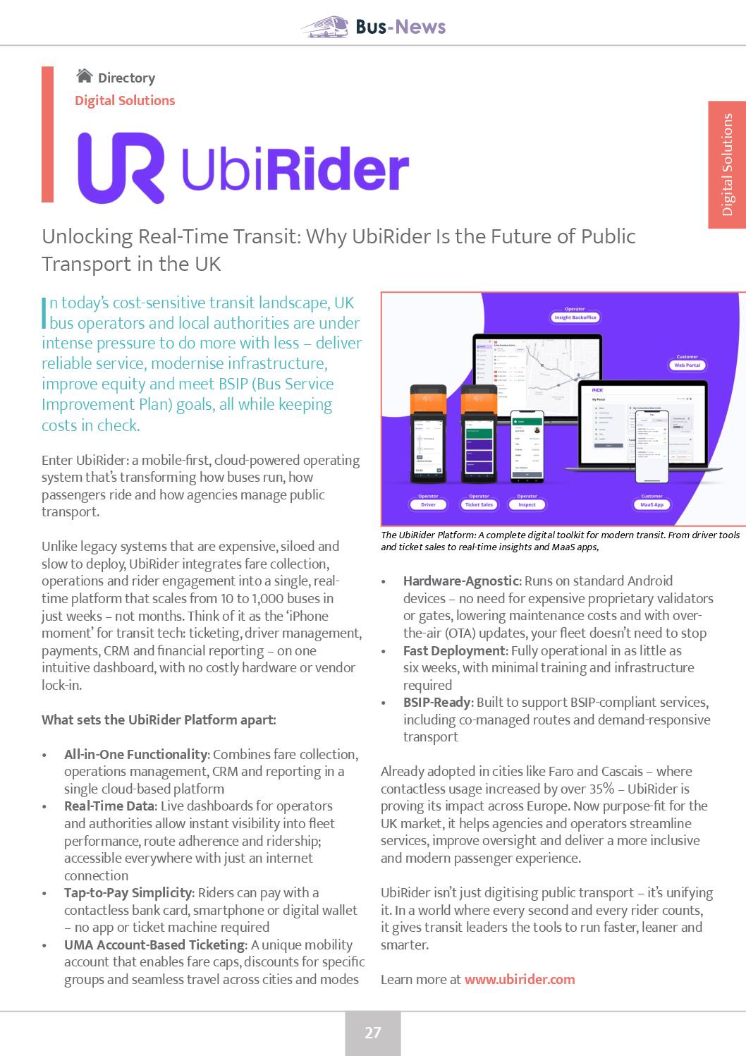 Whether for a small rural network or a large urban fleet, UbiRider delivers a modern, flexible foundation for more efficient, rider-friendly public transport.